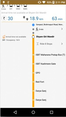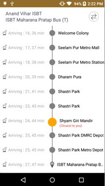 - On selection of a particular route, its origin, destination and all intermediate bus-stops along with the current buses running on that route will be shown, along with the ETA.